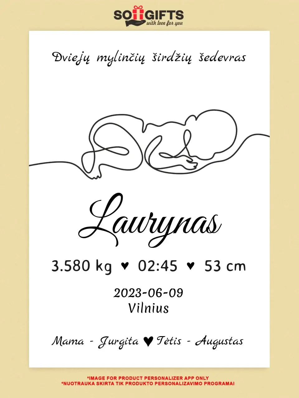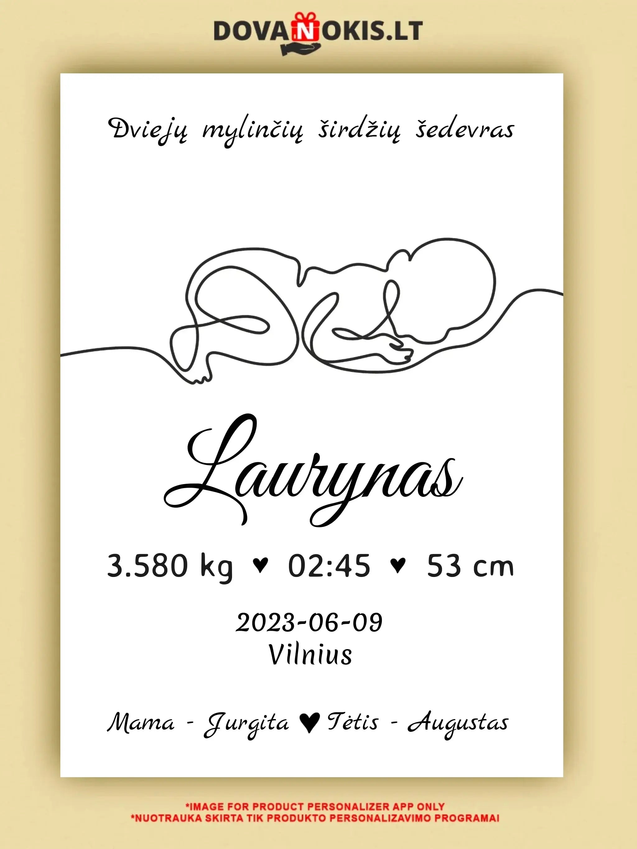 Personalizuota Vaiko / Kūdikio Gimimo Metrika su linijine iliustracija, plakatas su rėmeliu