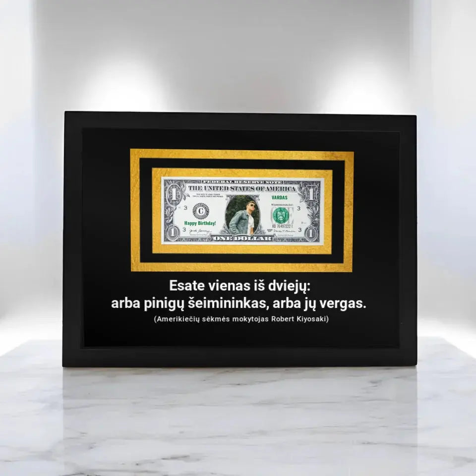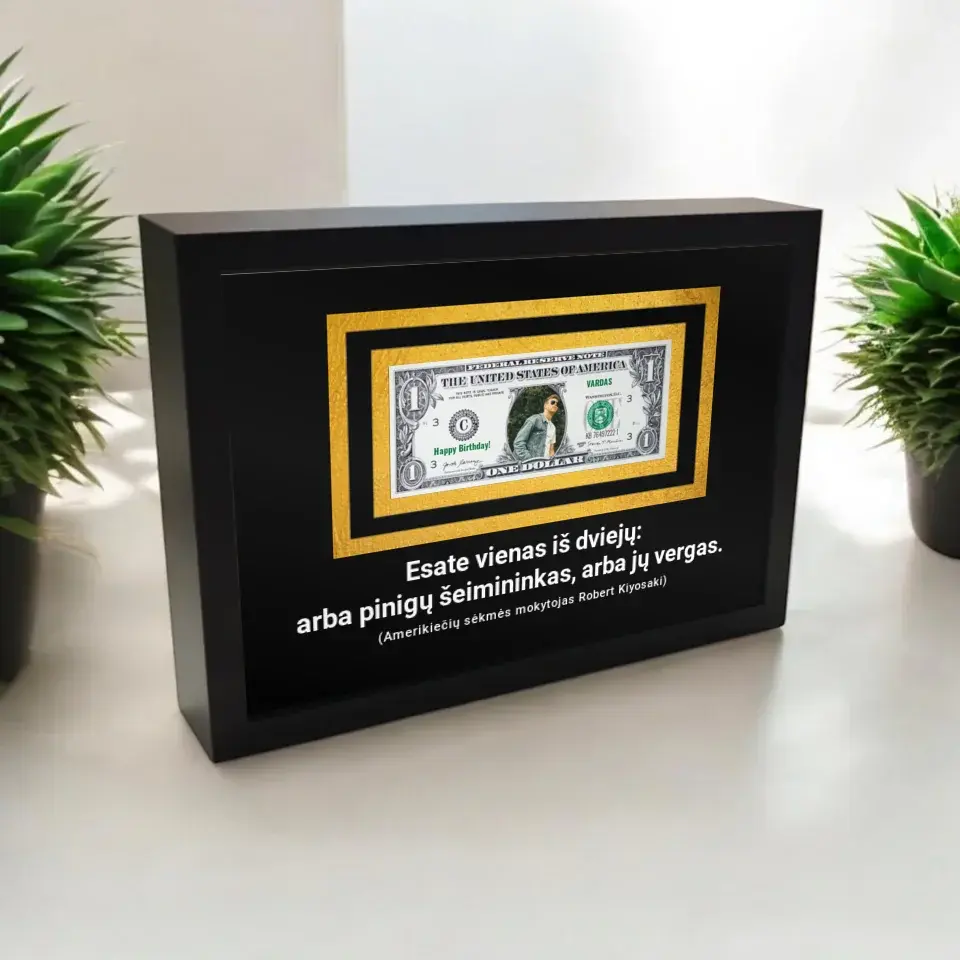 3D pinigų rėmelis su 1 JAV personalizuoto dolerio kupiūra ir jūsų nuotrauka.