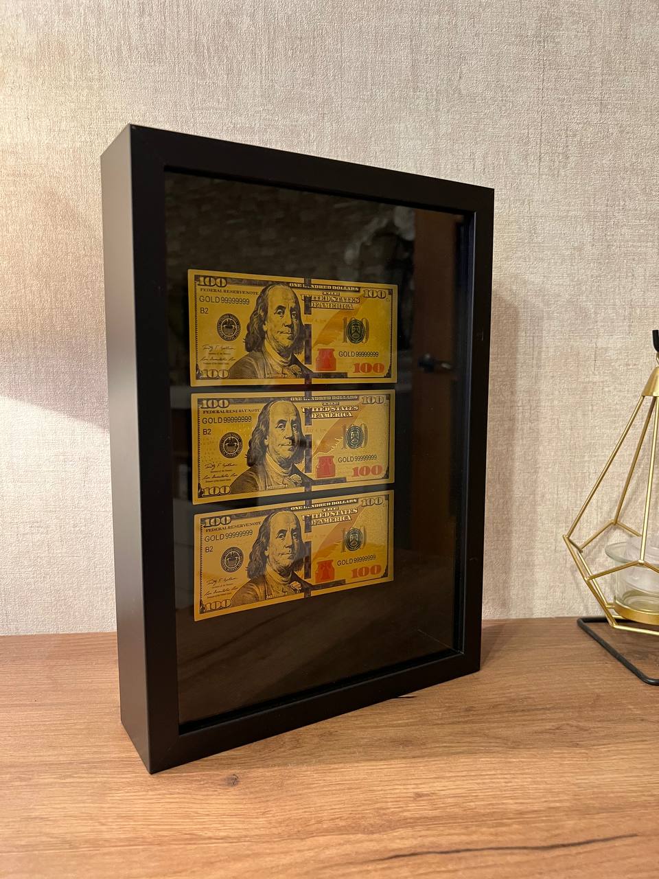 3D pinigų rėmelis su 3 auksiniais 100 JAV dolerių banknotais.