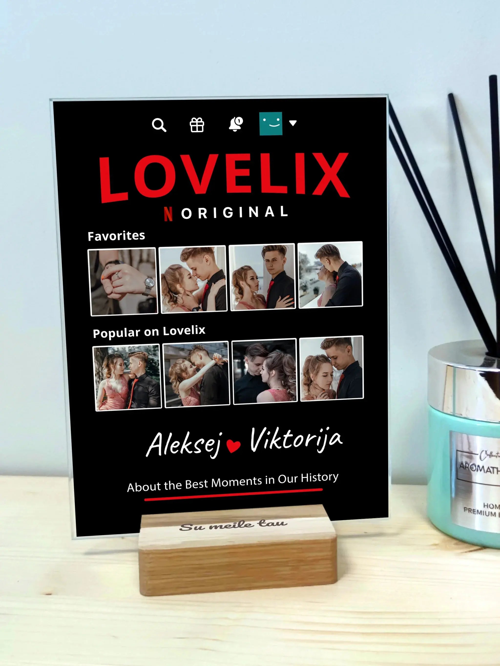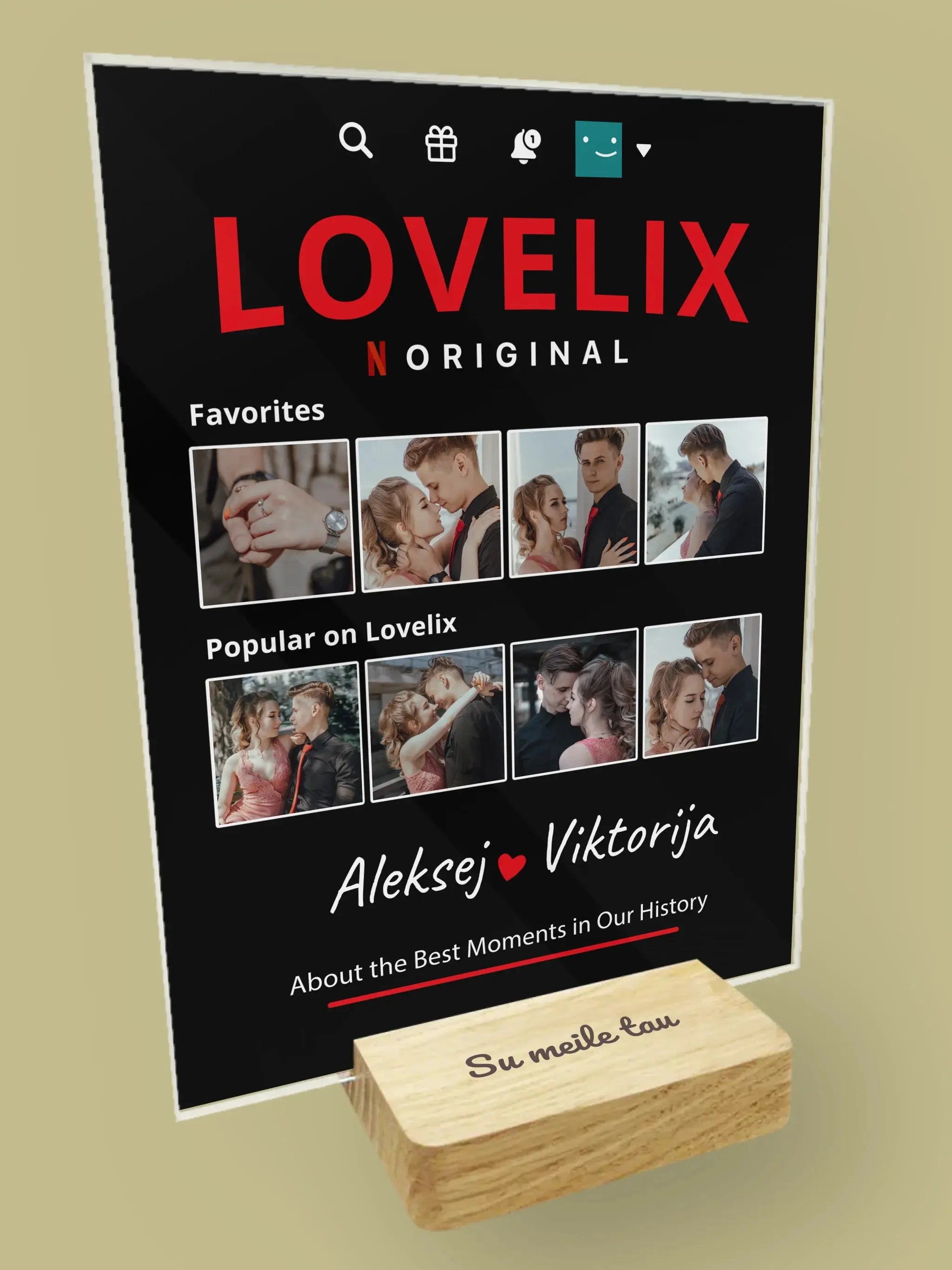 Personalizuotas "Lovelix" dizaino kūrinys ant stiklo su jūsų nuotraukomis ir vardais