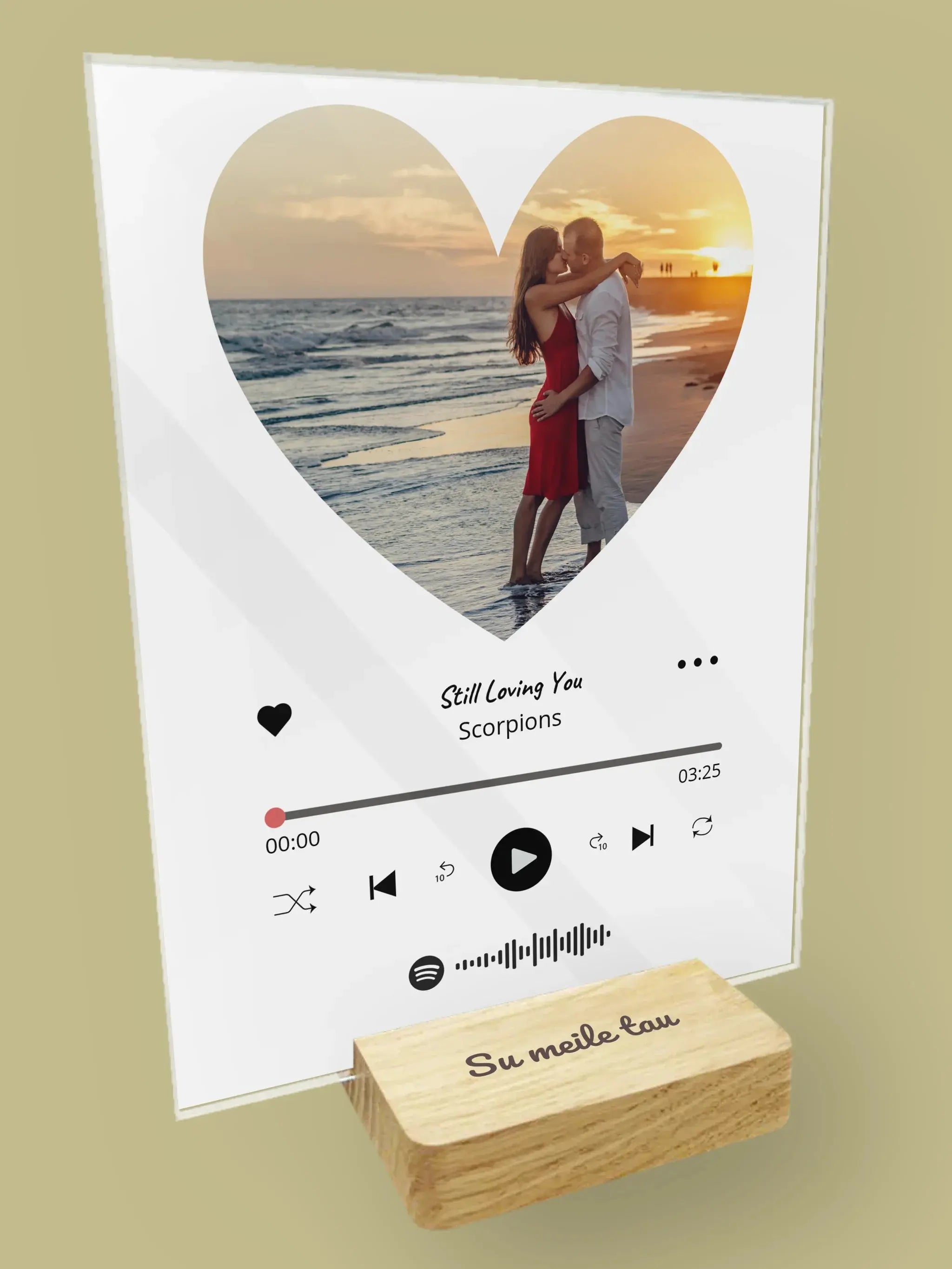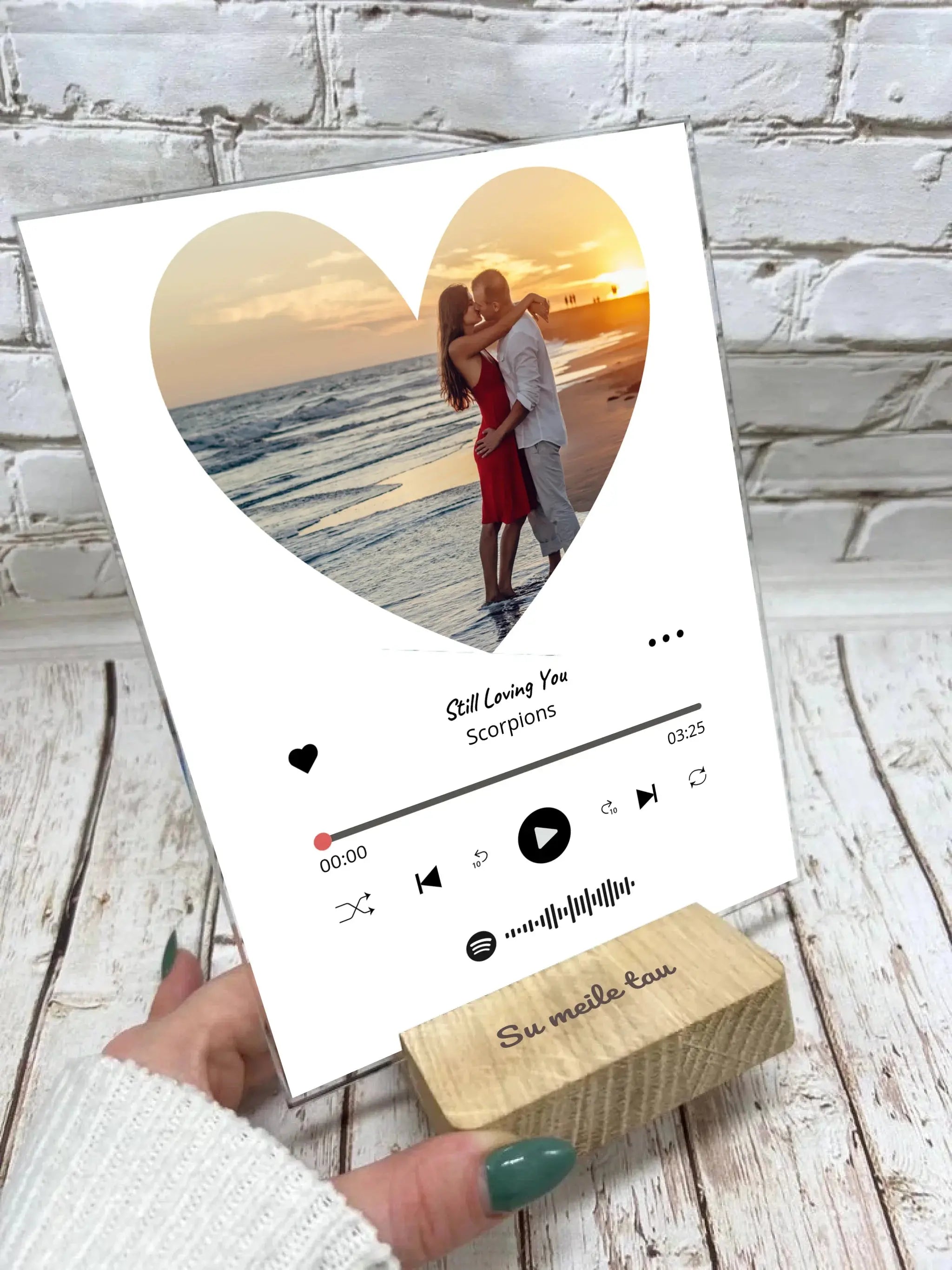Įamžinkite mėgstamą nuotrauką, pridėkite mylimos dainos pavadinimą ar QR kodą, ir mes sukursime modernų, minimalistinį interjero akcentą, kuris spinduliuos šilumą ir prisiminimus.