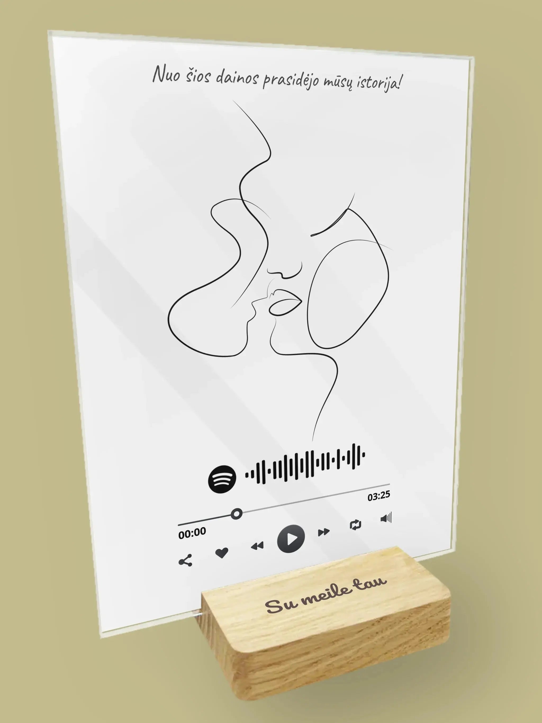 Įamžinkite mėgstamą nuotrauką, pridėkite mylimos dainos pavadinimą ar QR kodą, ir mes sukursime modernų, minimalistinį interjero akcentą, kuris spinduliuos šilumą ir prisiminimus.