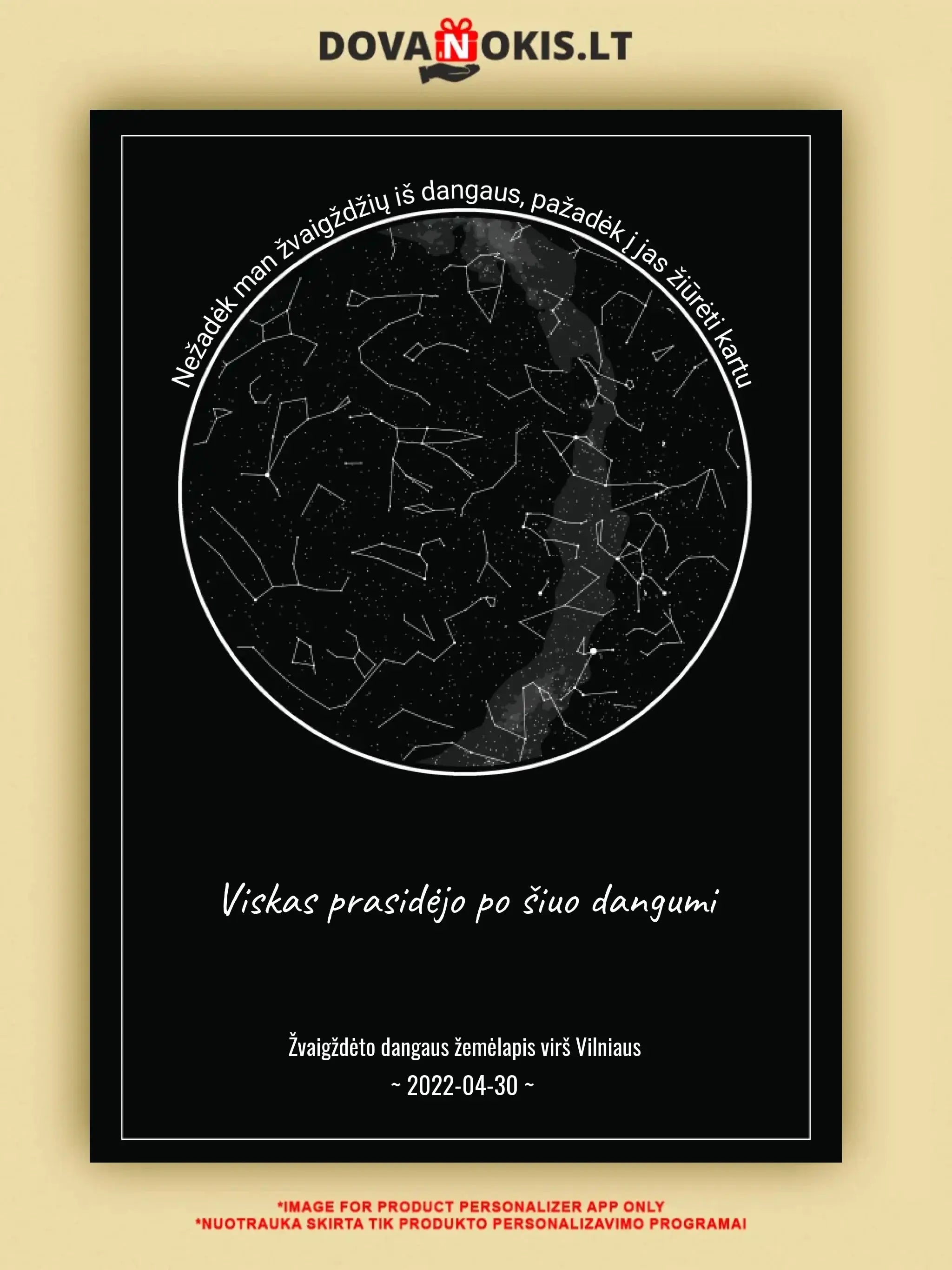 Tai nuotrauka su tikslia žvaigždėto dangaus vieta, kuri buvo virš konkretaus miesto tam tikrą dieną ir tam tikru laiku. Pavyzdžiui, jūsų gimtadienis, pirmasis bučinys, vestuvių diena ar kūdikio gimimas