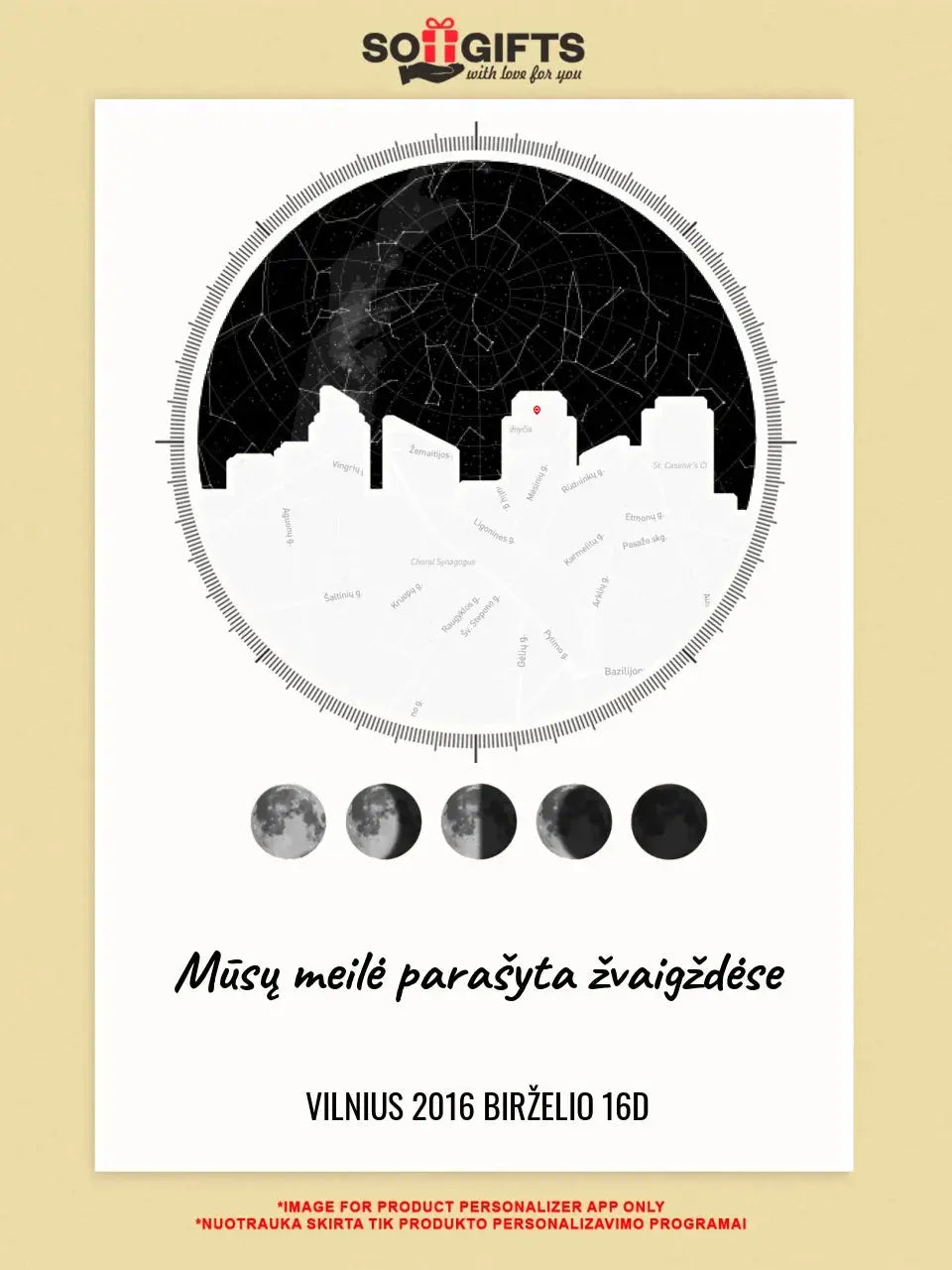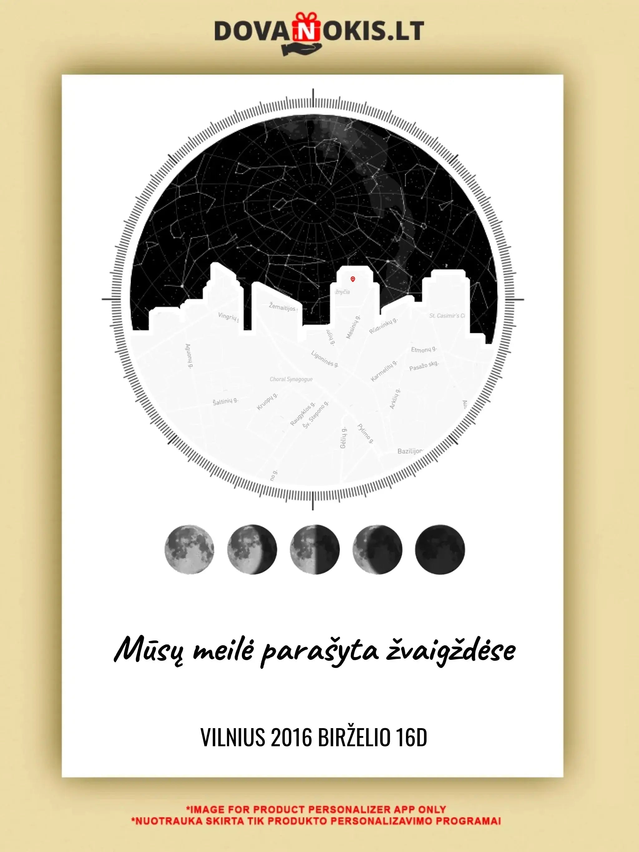 Tai nuotrauka su tikslia žvaigždėto dangaus vieta, kuri buvo virš konkretaus miesto tam tikrą dieną ir tam tikru laiku. Pavyzdžiui, jūsų gimtadienis, pirmasis bučinys, vestuvių diena ar kūdikio gimimas
